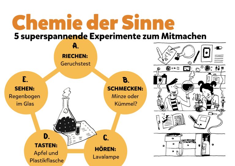 Heute nutzen wir unsere fünf Sinne, um chemische Phänomene zu begreifen: Was blubbert und zischt da so laut in der Lavalampe? Wieso schmecken Kümmel und Minze unterschiedlich und was hat eine Plastikflasche mit Äpfeln zu tun? Wie hilft dir Zucker dabei, einen Regenbogen ins Glas zu zaubern? ‒ In fünf spannenden Experimenten findest du Antworten auf diese und noch mehr Fragen.
